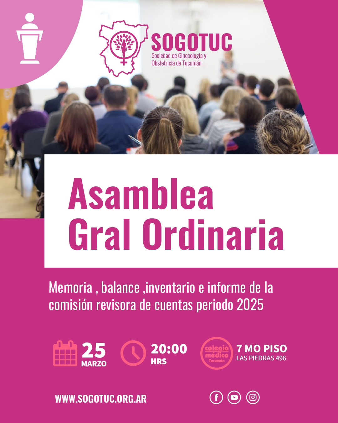 La Sociedad de Ginecología y Obstetricia de Tucumán convoca a sus asociados a participar de la Asamblea General Ordinaria correspondiente al período 2025.
